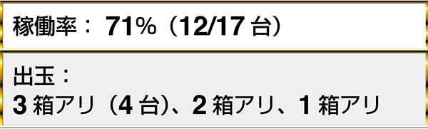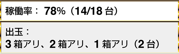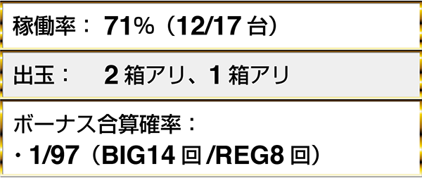 稼働率が70%を超えていた『バジリスク~甲賀忍法帖~絆』と『沖ドキ!-30』をあわせて、7名のプレイヤーが2箱以上の出玉を獲得していた。