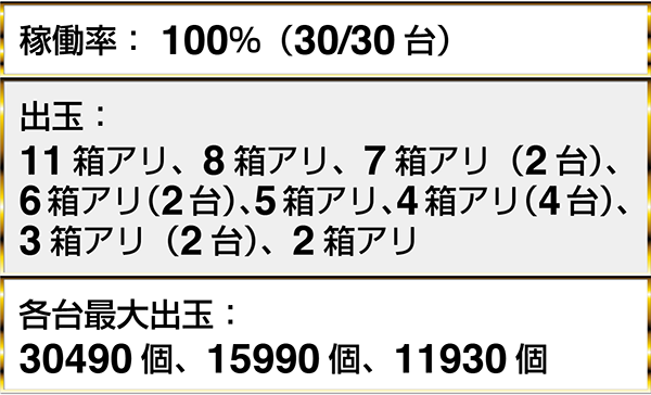 新台の『CRぱちんこウルトラセブン2』が満席となっており、30000個を超える最大獲得出玉もみられた。