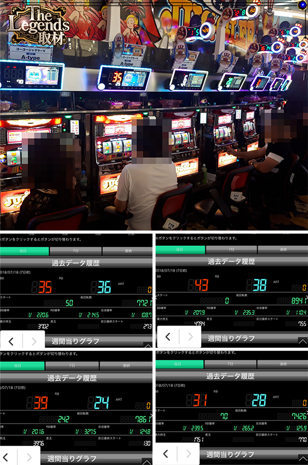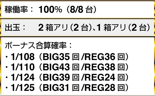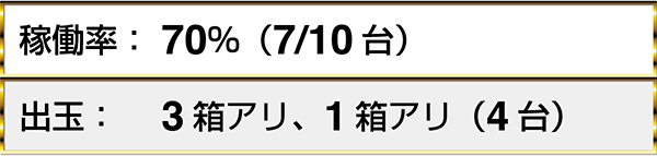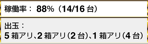 14時頃の取材時に『ゴーゴージャグラー』が満席となっており、5割のプレイヤーが持ち玉で遊技をおこなっていた。