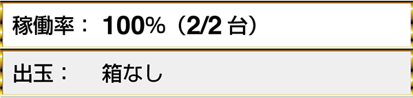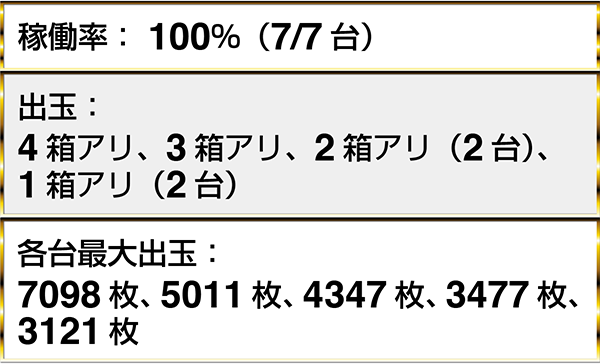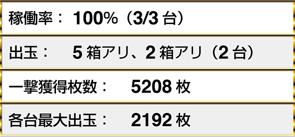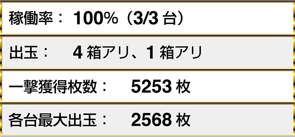 『パチスロ黄門ちゃま 喝』と『スーパービンゴネオ』が満席となっており、どちらの機種でも5000枚を超える一撃獲得出玉を目にしている。