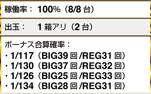 ・『ゴーゴージャグラー』にボーナス合算確率1/130以下が2台