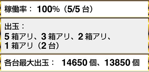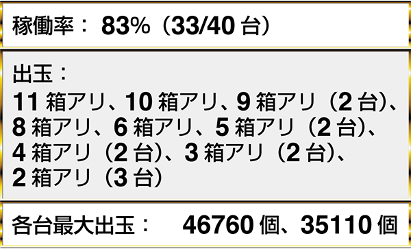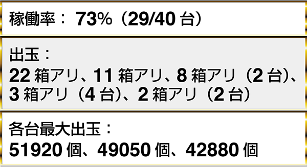 『ぱちんこCR真・北斗無双』と『CR大海物語4』において、最大獲得出玉30000個overのデータを確認した。