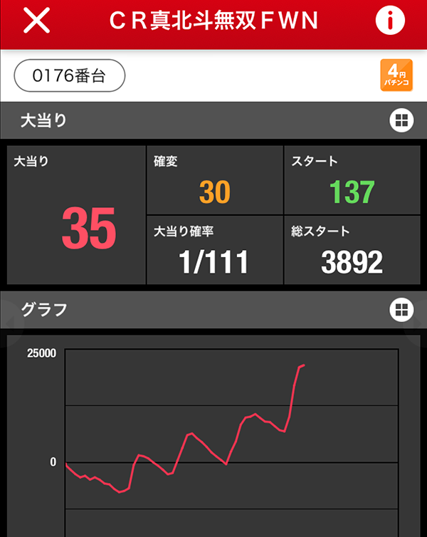 「ぱちんこCR真・北斗無双」にも、魅力的な展開で遊技を楽しむ姿があり、データ表示器に描かれたグラフからも満足度の高さがうかがえた。