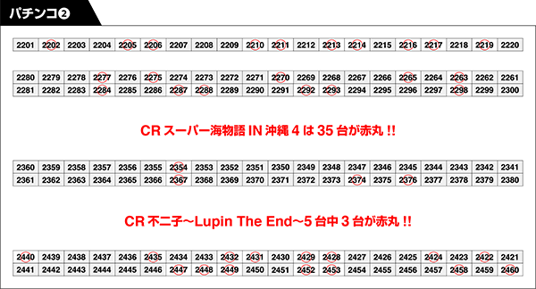 パチンコ・パチスロともに盛況となっており、さまざまな台に赤丸をつけた。