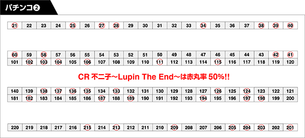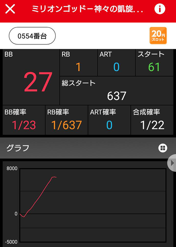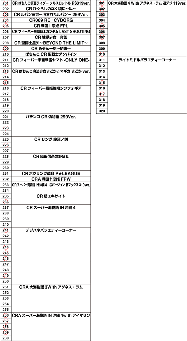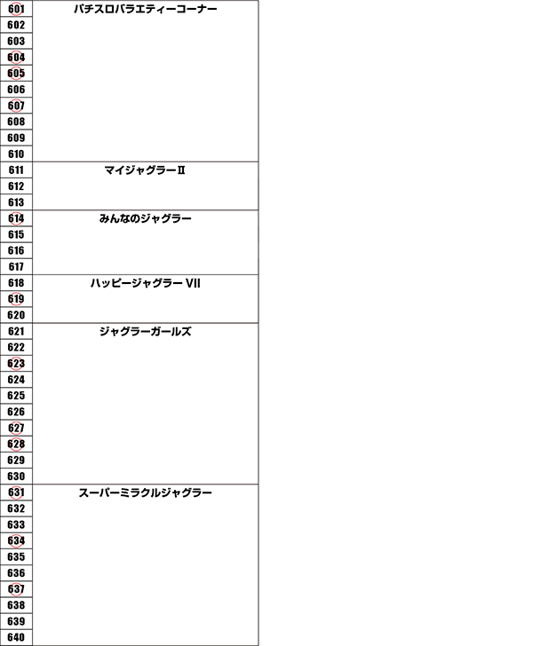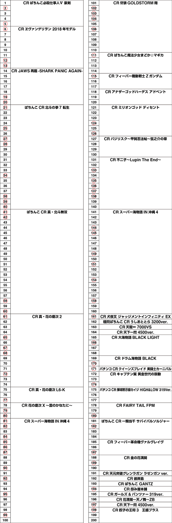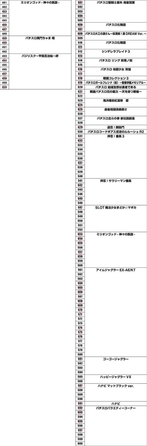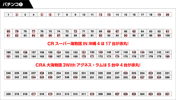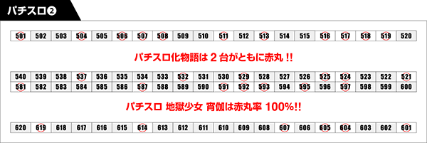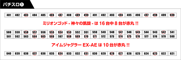 パチスロにおいては、「バジリスク~甲賀忍法帖~絆」が8台中4台、「ミリオンゴッド-神々の凱旋-」は16台中8台が赤丸。