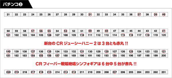 プレイヤーの笑顔が目立つ「CRジューシーハニー2」では、3台すべてに赤丸をつけた。