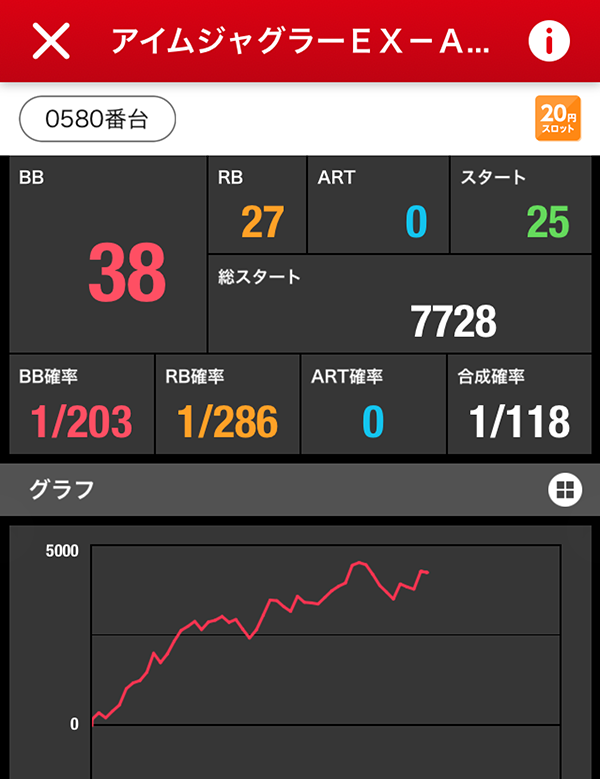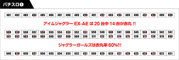 パチスロでは、「アイムジャグラーEX-AE」がひときわ盛況。20台中14台に赤丸をつけた。
