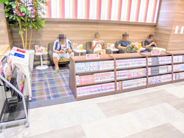 レストスペースには幅広いジャンルの漫画本や雑誌が用意されており、取材時も利用するプレイヤーが多かった。
