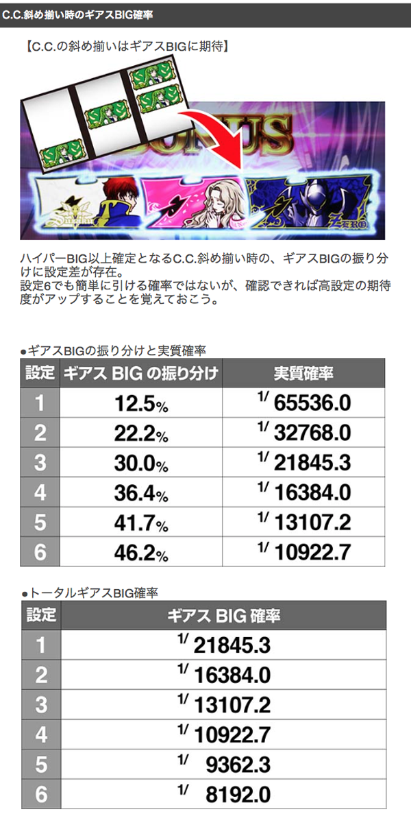 ボーナス確率のなかでは、とくに設定差が大きいギアスBIGに注目。何度もひければ高設定に期待できる。