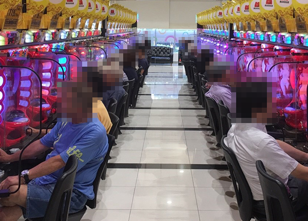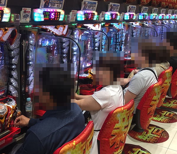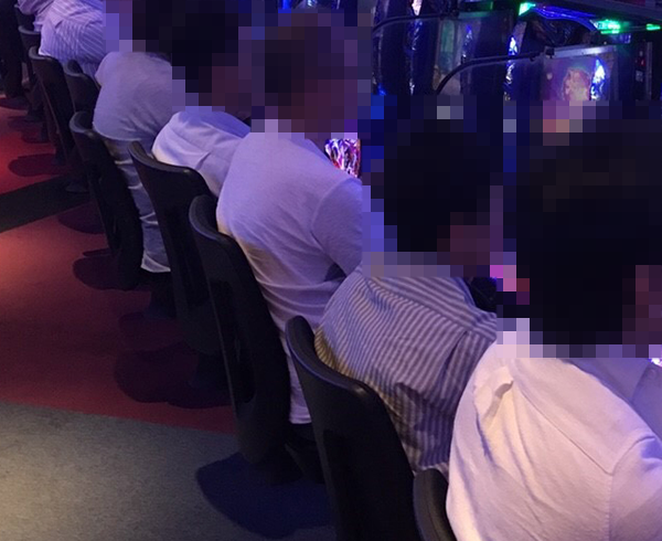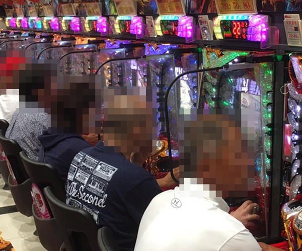 低貸し玉コーナーにおいて、とくに厚く支持されていたのは1円パチンコの海物語シリーズ。多くのプレイヤーが楽しげな笑みを浮かべながら遊技をおこなっていた。