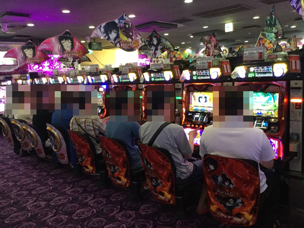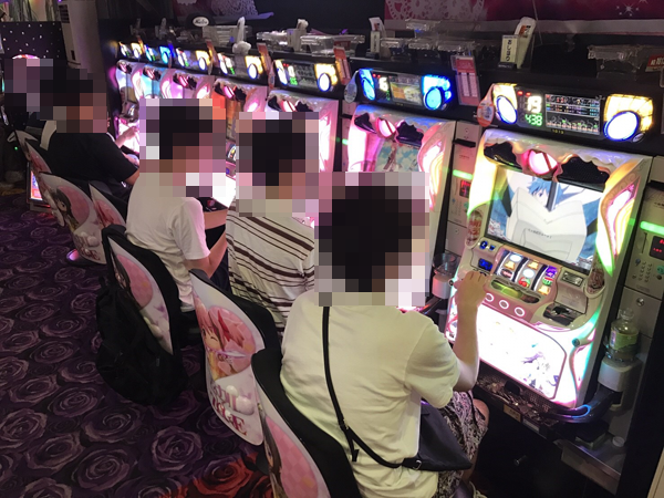 オープン直後のパチスロをみると、「バジリスク~甲賀忍法帖~絆」や「押忍!番長3」など、数多くの機種が満席。