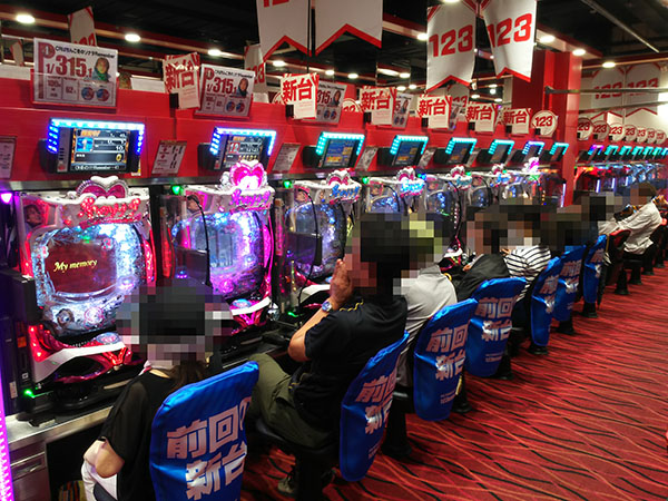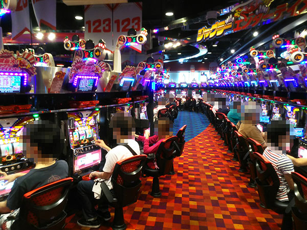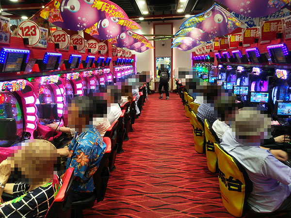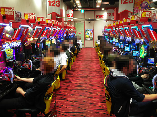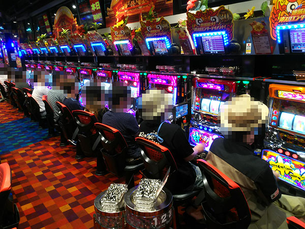 取材時の店内には多くのプレイヤーが来店。パチンコ・パチスロを問わずにぎやかな状況となっていた。