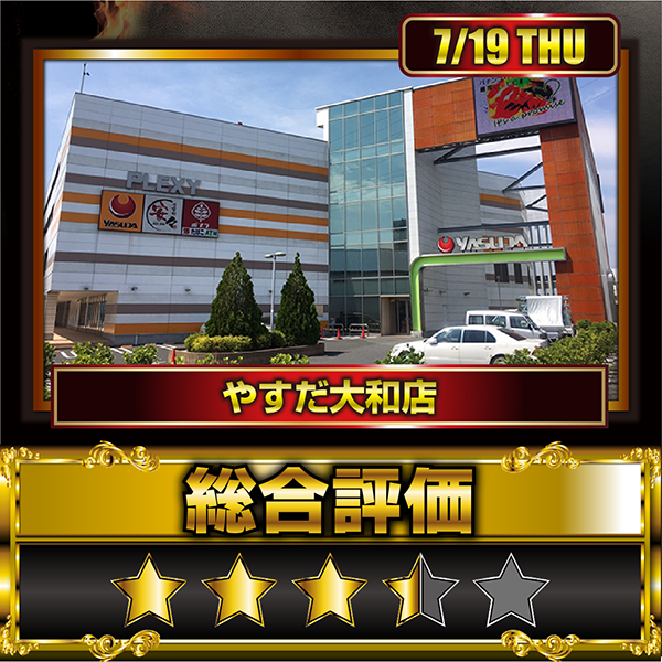 晴れやかな空のもと、7月19日に足を運んだのは「やすだ大和店」。コンビニや食事処を併設しているため、長い時間でも気持ちよく遊技を楽しめそうだ。