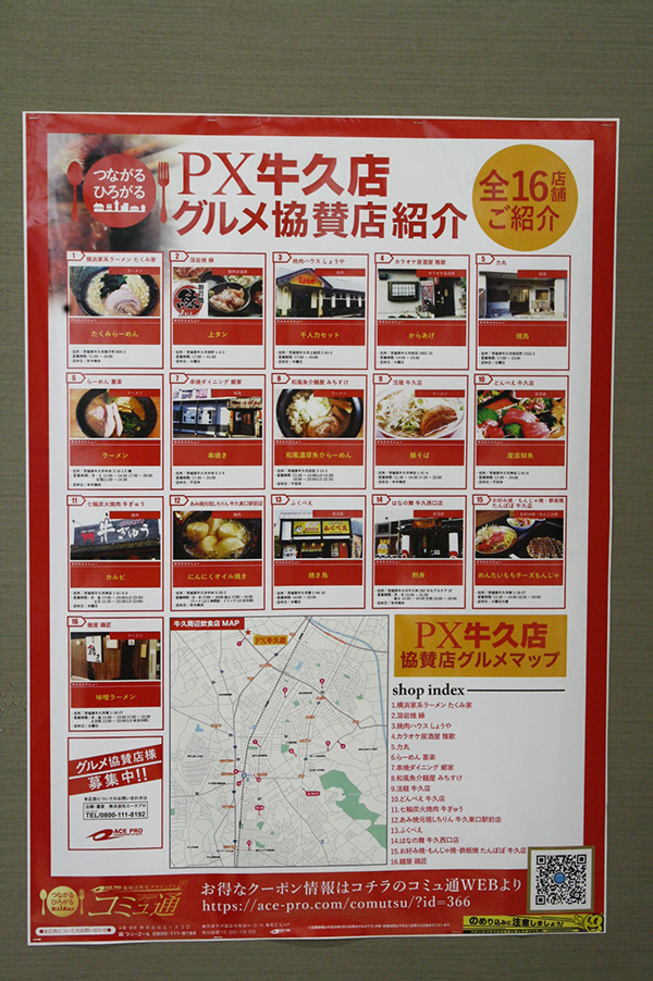 ホール内にグルメマップが掲示されており、近隣の飲食店を紹介していることも印象的。昼食の際や夕食のお店選びの参考にするなど、さまざまなシーンで活用できる素敵なサービスだと思った。