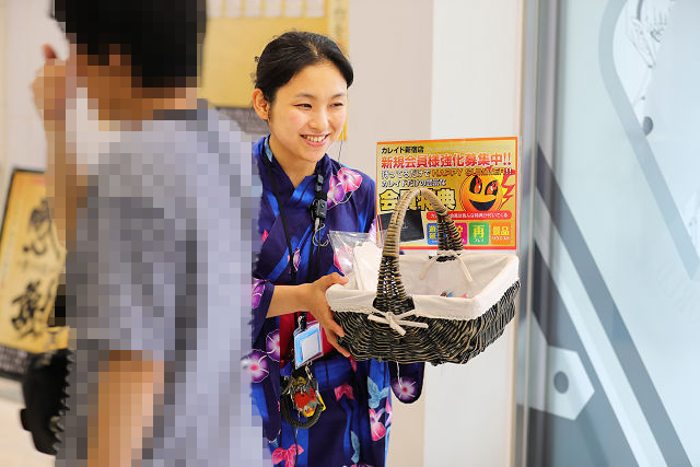 その後も、さらに入店するファンに、「カレイド女子」こと「カレ女」が、飴ちゃんに手袋等を配布し、おもてなし!