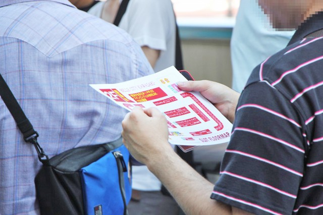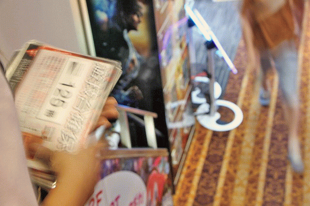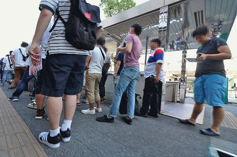 | 台確保の鍵を握る重要な情報源(シマ図)は、待機列のファンに配布。受け取ったファンは、入念にチェックしていた。 | |