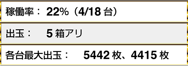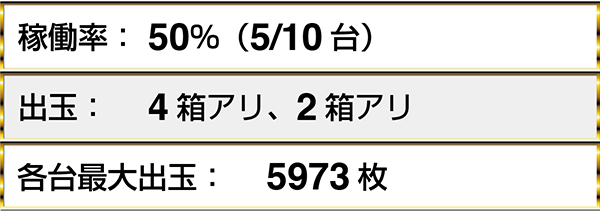 『バジリスク~甲賀忍法帖~絆』と『沖ドキ!』では、最大獲得枚数5000枚超を確認した。