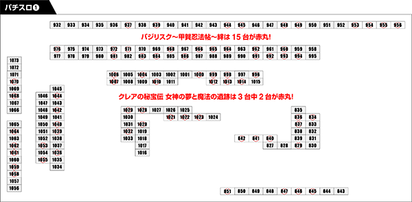 パチスロコーナーをみると、「沖ドキ!-30」や「ミリオンゴッド-神々の凱旋-」に赤丸をつけるべき台が満載。