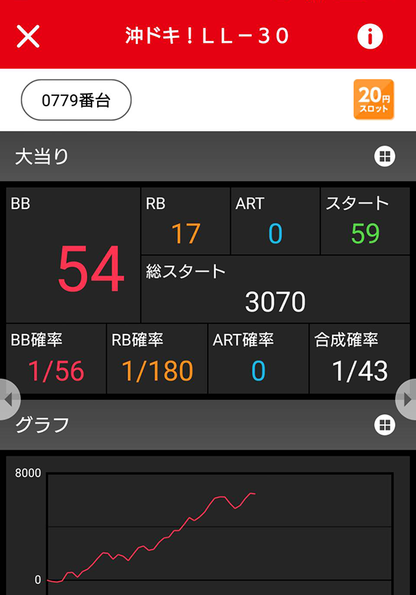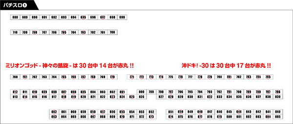 にぎやかなムードのパチスロでは、「沖ドキ!-30」が赤丸率50%オーバー!