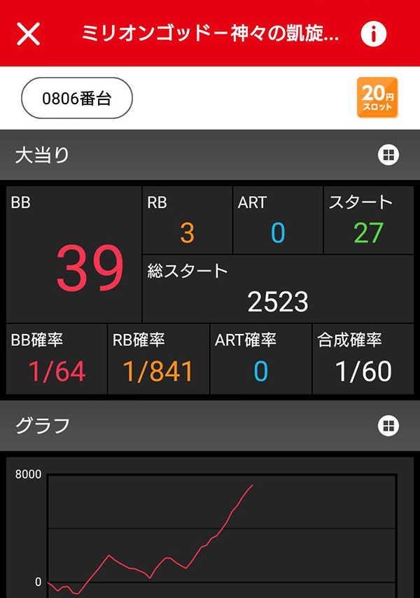隣に設置されている「ミリオンゴッド-神々の凱旋-」にも赤丸台にふさわしい台が多く、シマ全体に笑顔が広がっていた。