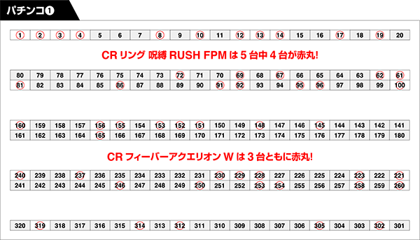 「CRフィーバーアクエリオンW」はすべての台が赤丸と好調であった。