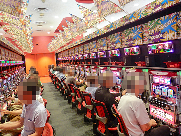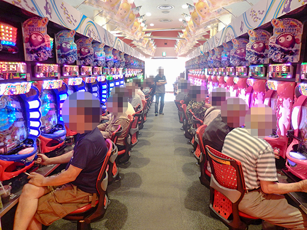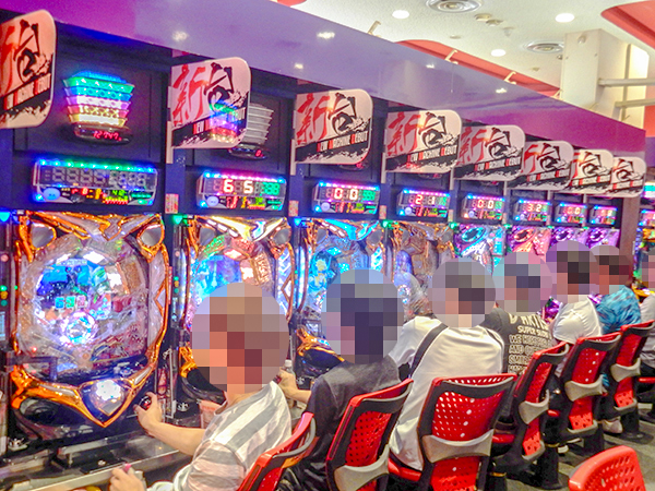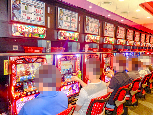 取材時の店内には多くのプレイヤーが来店。パチンコ・パチスロ共に、様々な機種が支持を集めていた。