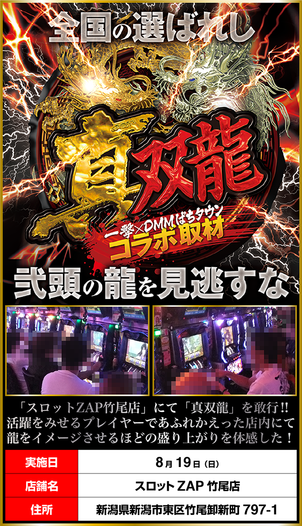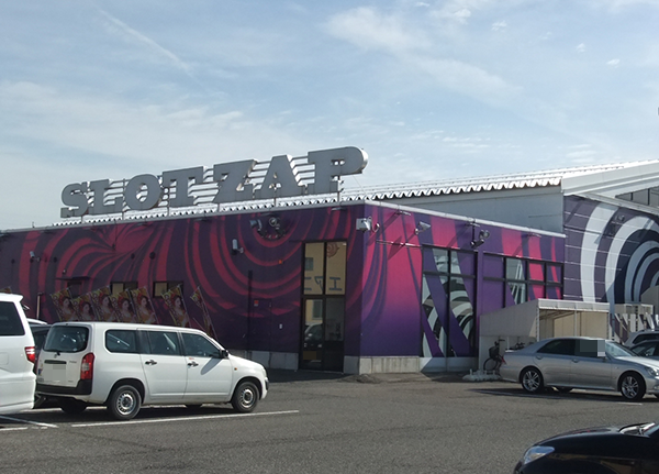 「真双龍」の舞台となったのは、鮮やかな色づかいの外観も特徴的な「スロットZAP竹尾店」。