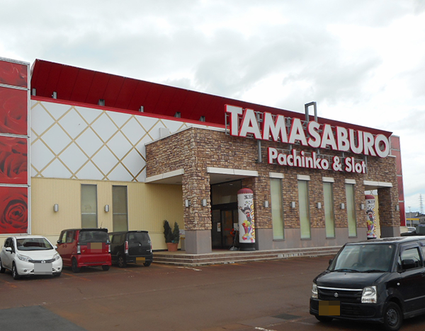 「真双龍」の舞台となった場所は、バラのイラストが描かれていたり、石材を使用した部分があったりと、外観からもこだわりが感じられる「パチンコ玉三郎小千谷店」。