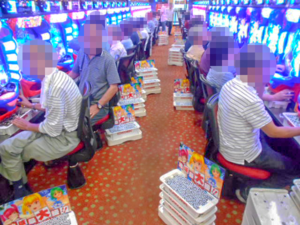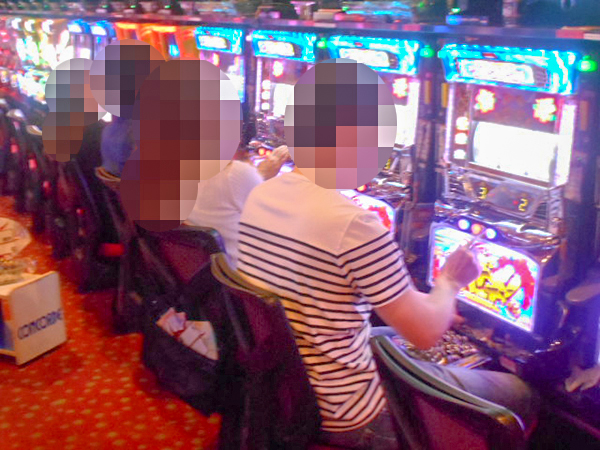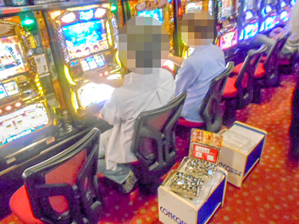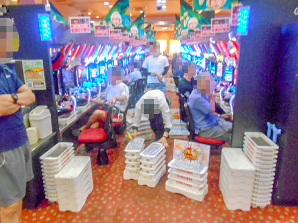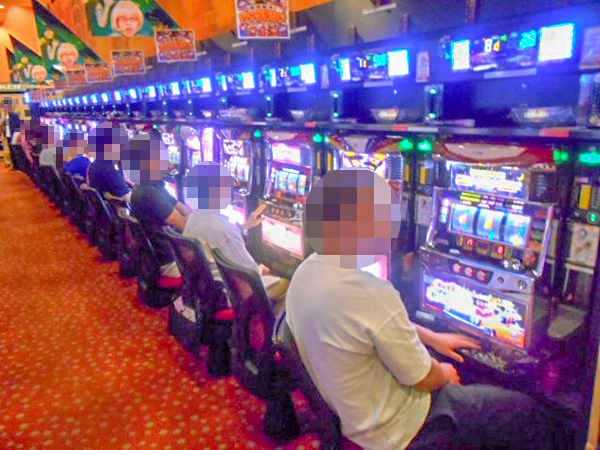 10円・5円パチスロは機種を問わず人気。シマ全体がプレイヤーたちの笑顔でいっぱいになっていた。