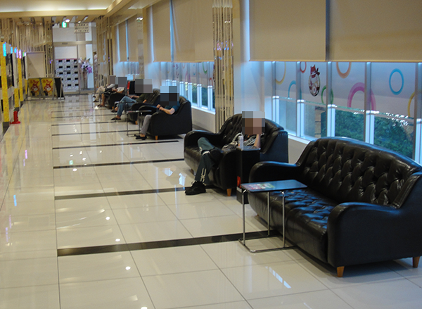 シマの近くには、ソファがたくさん用意されている。遊技台がみえる位置にあるため、空き台を待つ時間などにもピッタリといった印象を受けた。