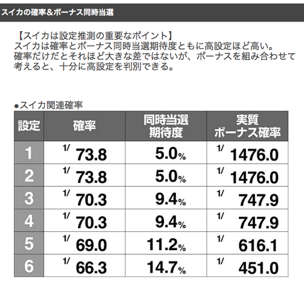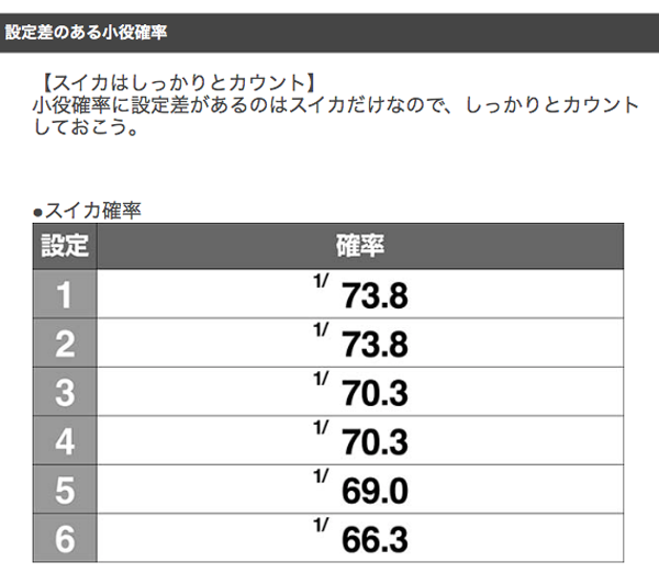 スイカとボーナスの同時当選確率に大きな設定差が存在。スイカ確率自体も高設定ほど高くなっているので、忘れずにカウントしておこう。