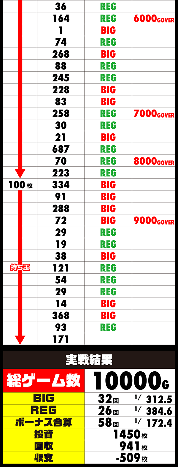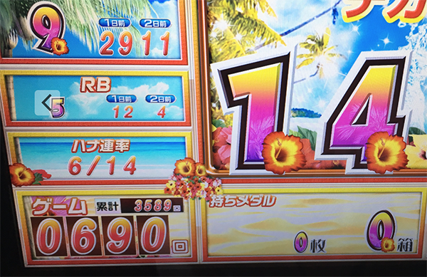 朝イチに台移動をおこなったことでタイムロスがあったものの、2台目では着実にゲーム数を積み重ね、15時頃には3600Gを消化。