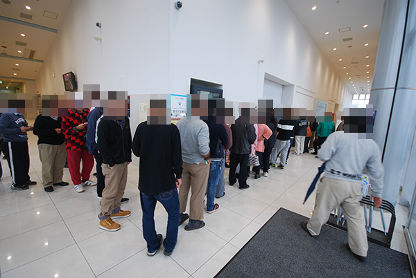 開店前には整理券が配布され、約30名のプレイヤーが受け取っていた。取材日は大雨と悪天候であったが、開店時には一般入場を合わせて70名以上が入店していった。