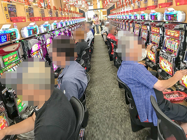 取材時の店内には多くのプレイヤーが来店。パチンコ・パチスロ共に、様々な機種が人気を集めていた。