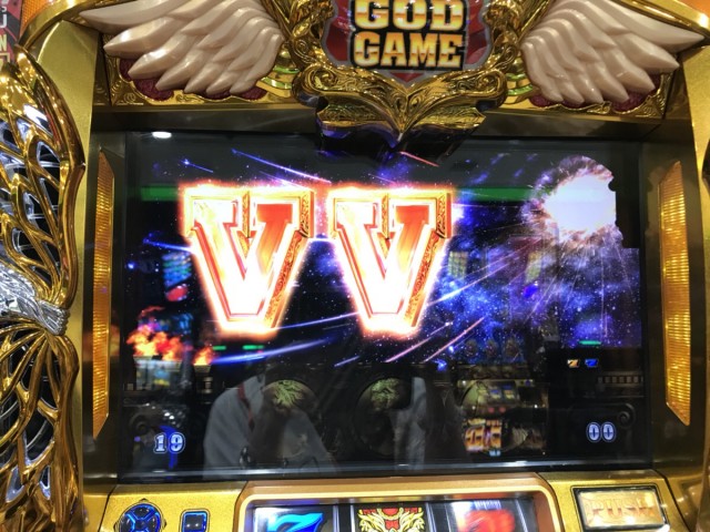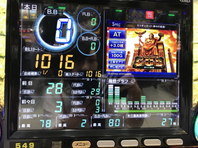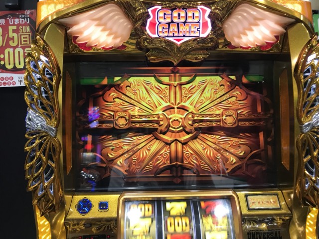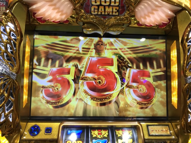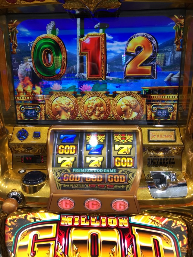前回大盛り上がりで狙い台の、『パチスロ聖闘士星矢 海皇覚醒』は即埋まりだったので、『ミリオンゴッド-神々の凱旋-』を取りました。