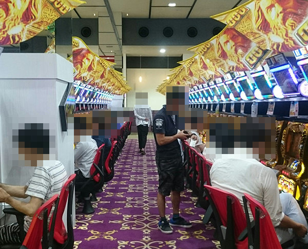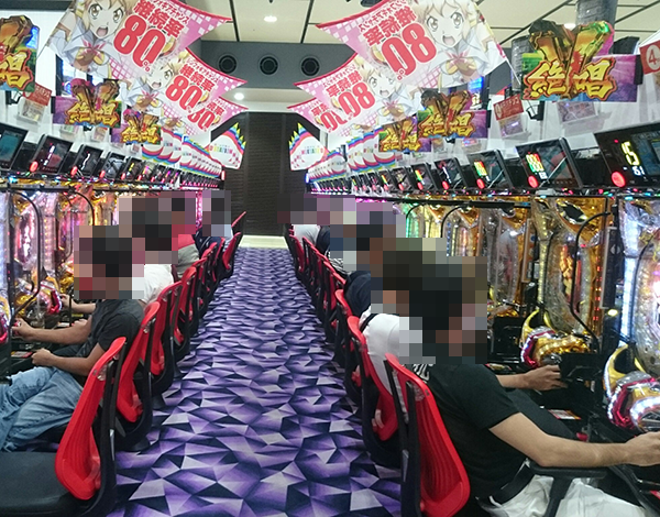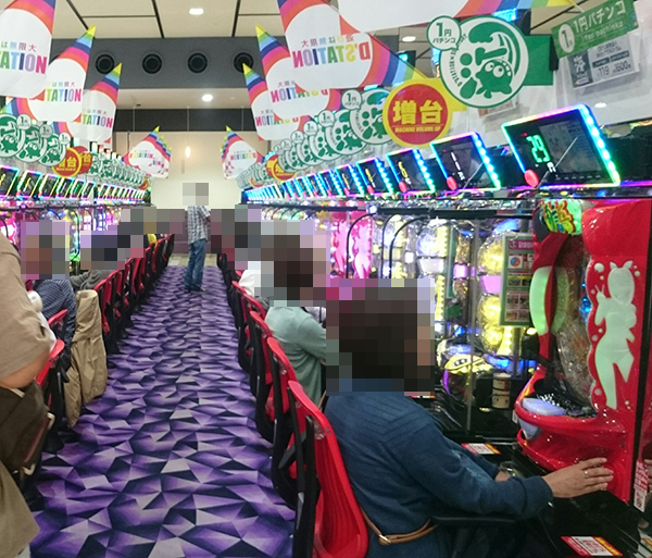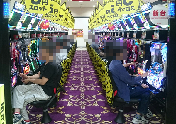 5円パチスロでは、「押忍!番長3」や「ミリオンゴッド-神々の凱旋-」などの盛り上がりが大きい。笑みを浮かべているプレイヤーがおり、満足度も高そうだ。