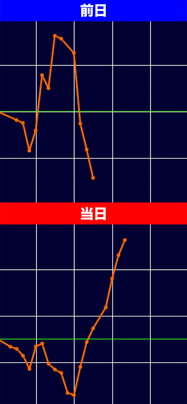 前日の流れを引き継ぐかと思いきや、気合いと根性で高く跳ね上がった軌跡。