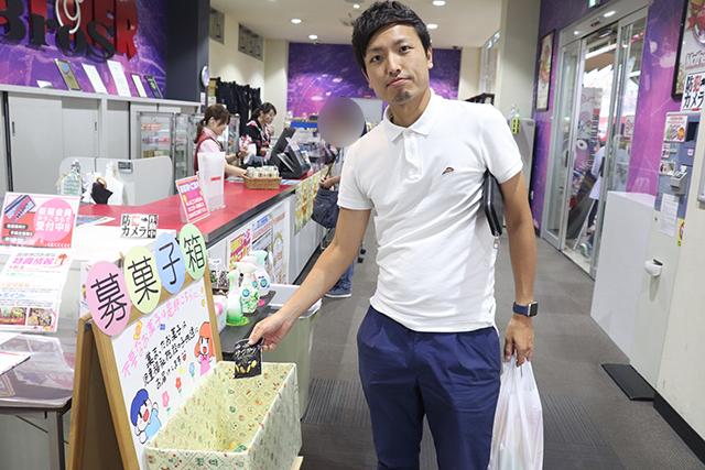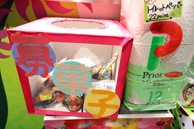 | 「マザーブロス」のカウンターの前にも、募菓子箱が設置されている。 |