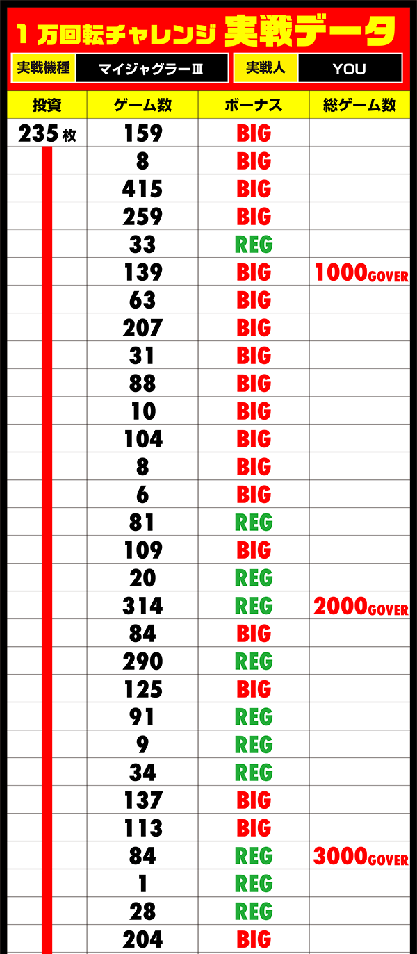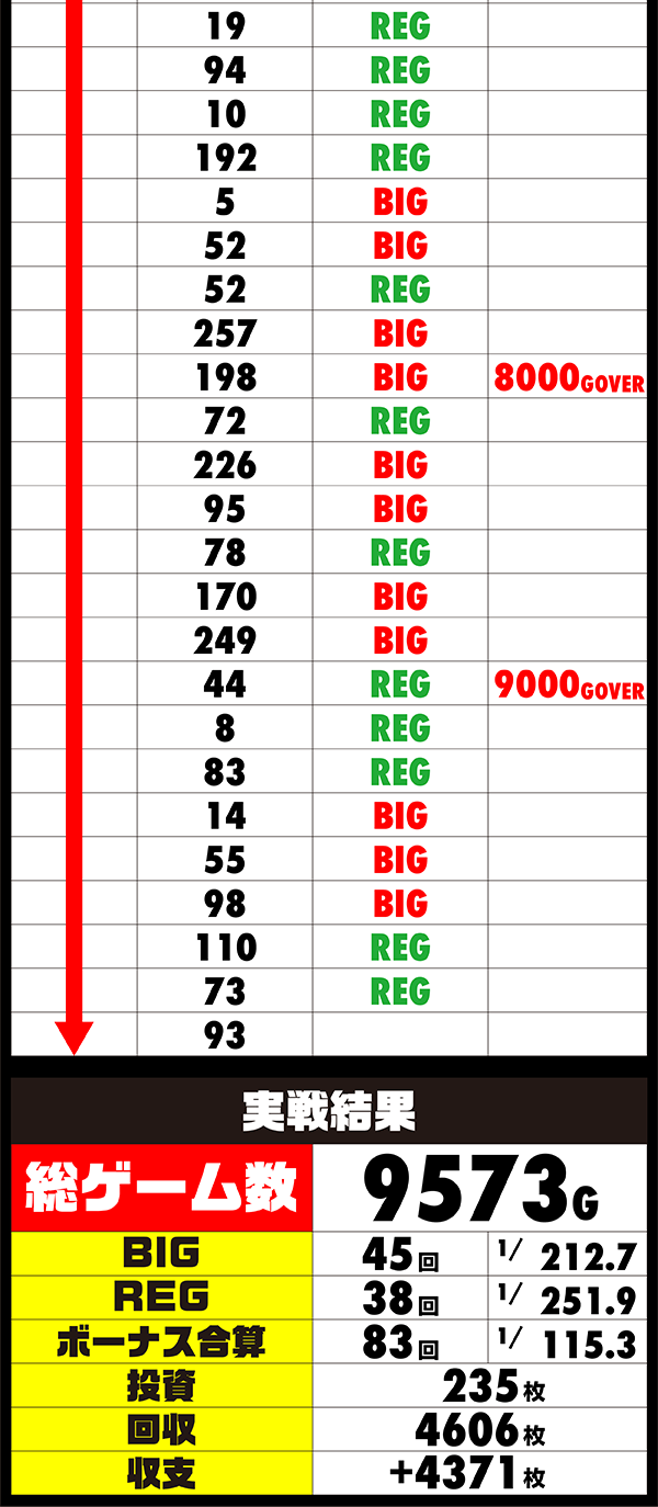 これだけのボーナスの多さでは、さすがにゲーム数を消化しきることができず、チャレンジのほうは400G以上を残して失敗。