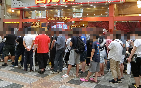 初日は朝イチから150人以上のプレイヤーが列を形成。商店街のなかに立地するホールの前は開店前から活気に包まれており、ホールへの期待感が伝わってきた。
