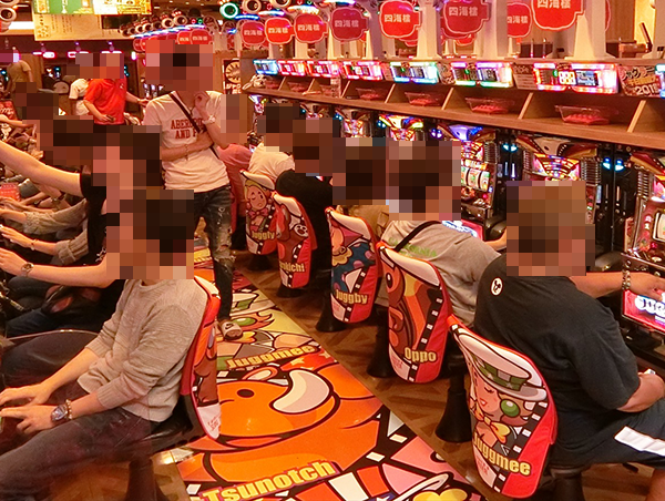なかでも、朝イチから支持を集めていたジャグラーシリーズに華やかな光景が広がっていた。