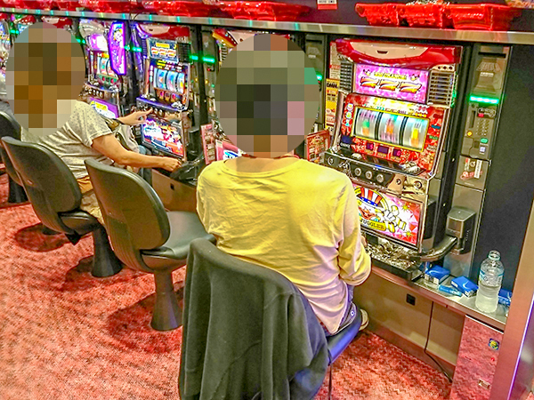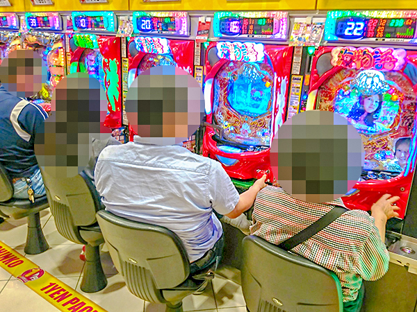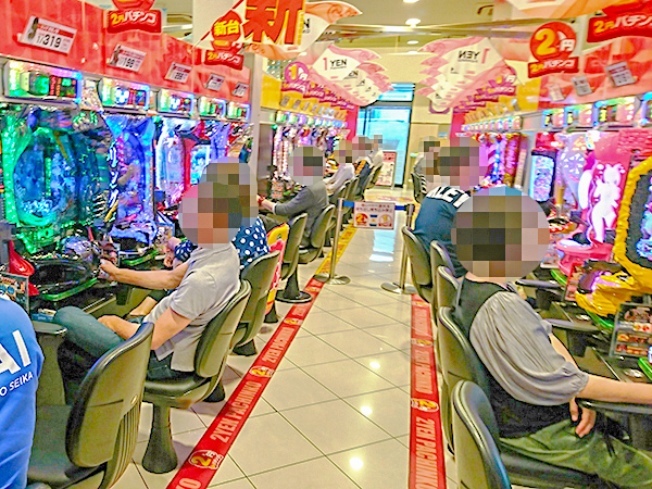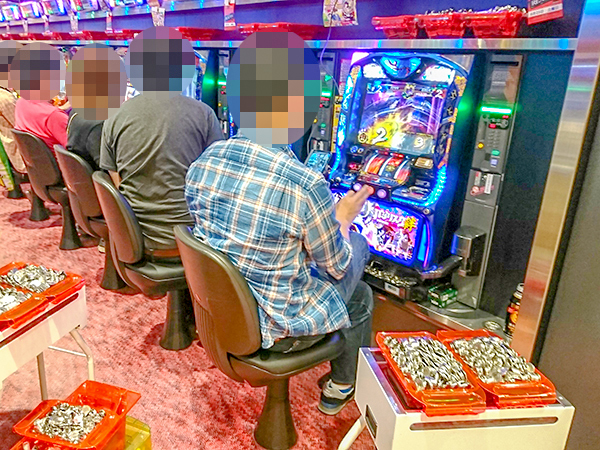 取材時の店内には多くのプレイヤーが来店。パチンコ・パチスロ共に、様々な機種が支持を集めていた。