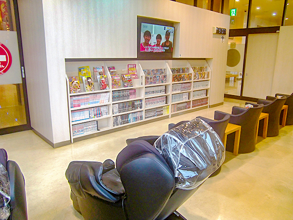 開放感抜群のレストスペースにはマッサージチェア・漫画本・テレビが用意されており、誰もがリフレッシュできることだろう。