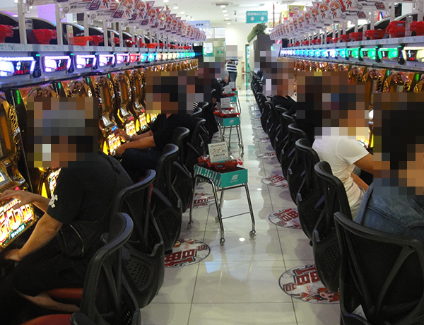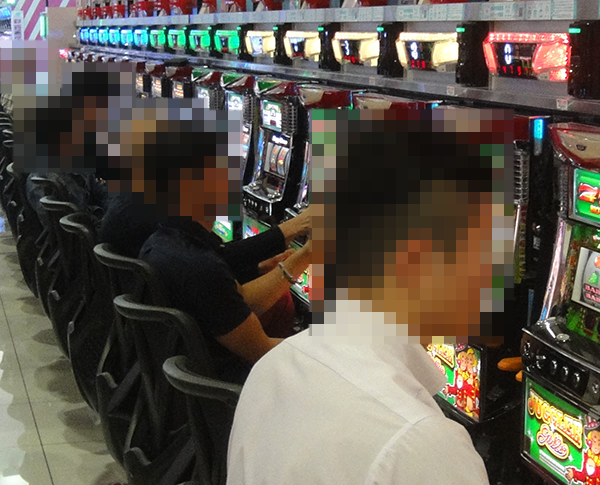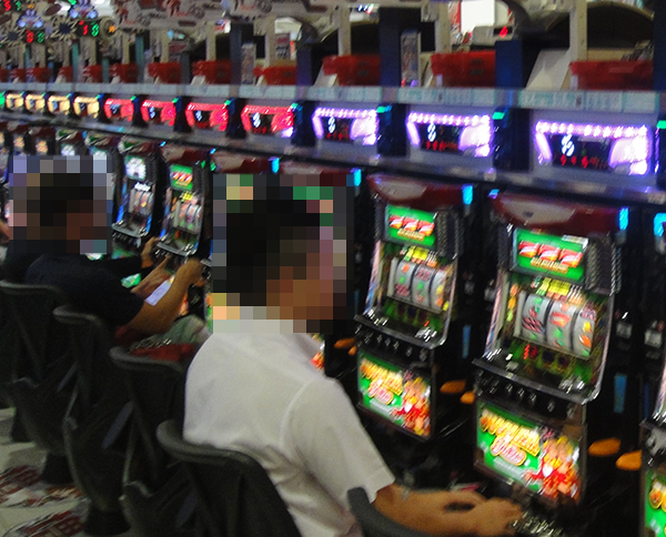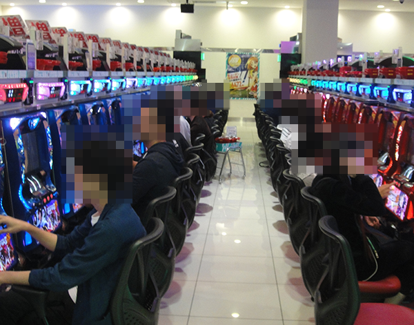 AT・ART機からボーナスタイプまで、多くの機種が楽しまれていた「新!ガーデン八潮」。なかでも、「ジャグラーガールズ」で遊技をおこなうプレイヤーの明るい表情が印象的であった。