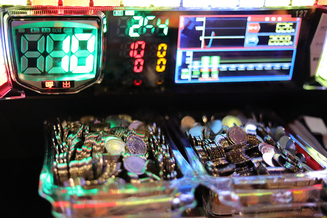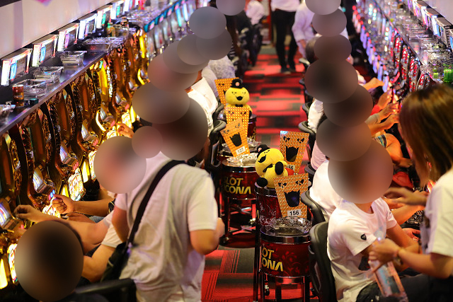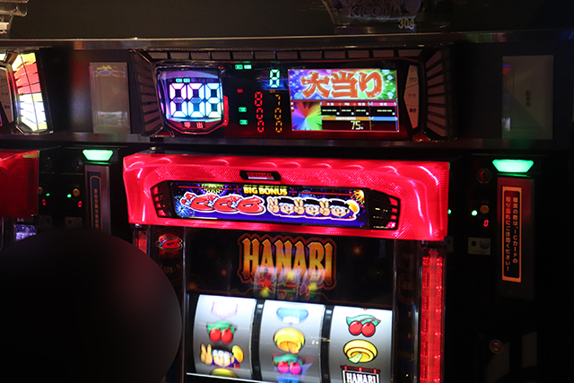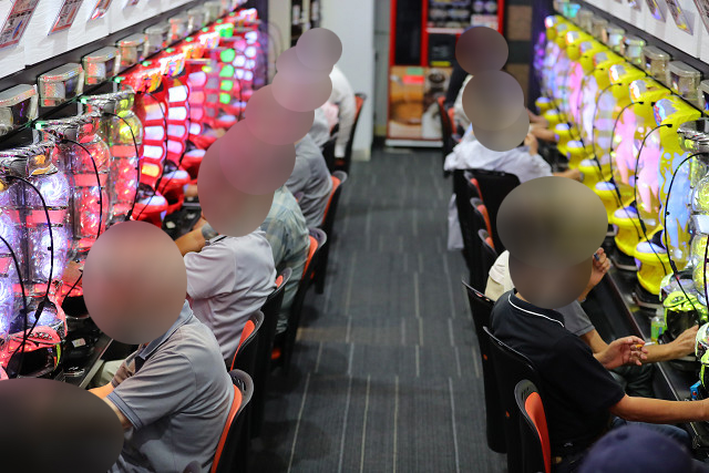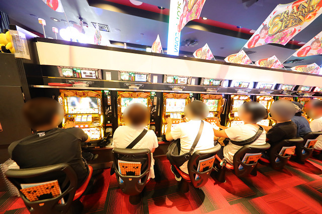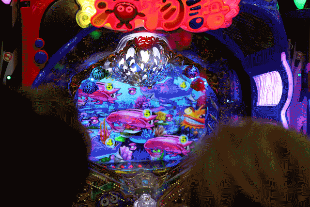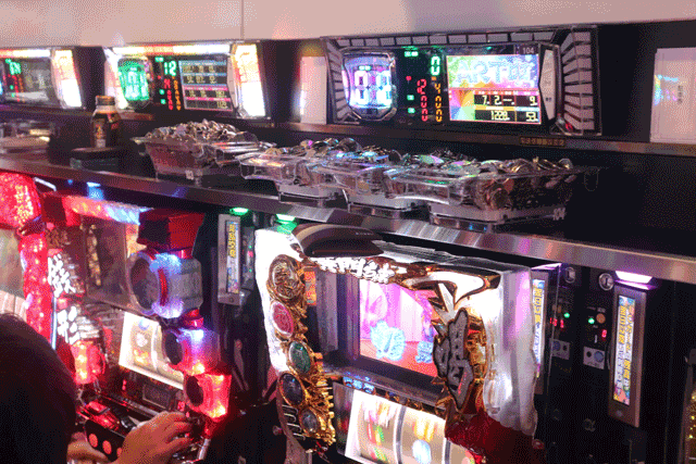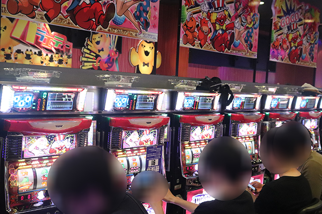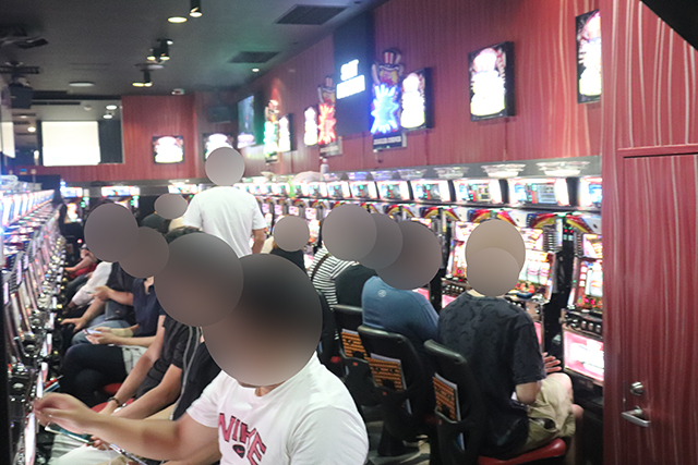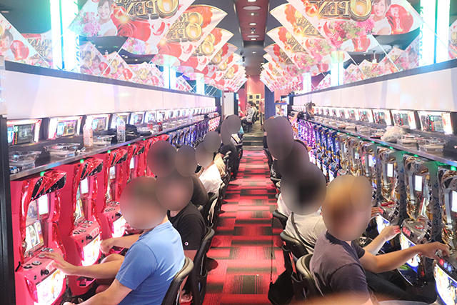 各機種の大当り演出によって、鮮やかな映像や軽快な音楽で溢れる店内。