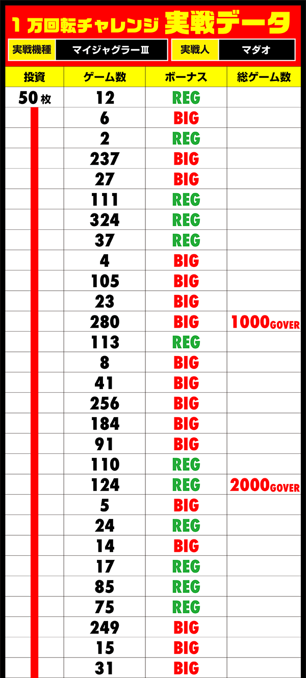 15時の時点で40回もボーナスを獲得しているのにもかかわらず、すでに4200Gを突破。ダブル達成に大きく期待できる状況で終盤をむかえられることとなった。