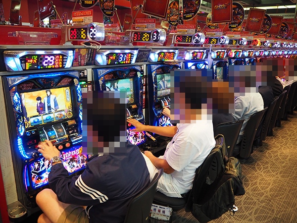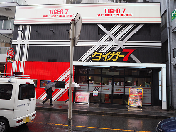 舞台となった神奈川県横浜市の「タイガーセブン綱島店」は、赤と黒の外観が特徴的なパチスロ専門店だ。