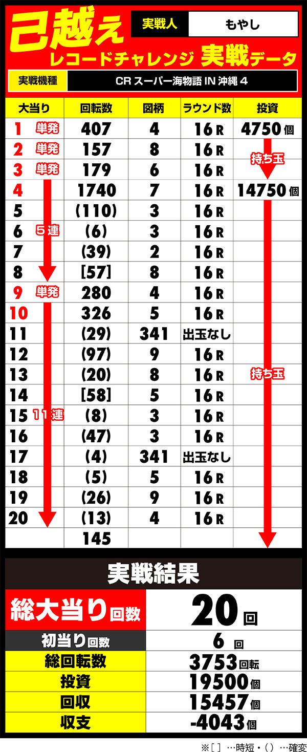 タイムアップ前には怒濤の10連チャンで意地をみせたものの、やはり1700回転オーバーのハマリが最後まで響き、己越えは失敗。