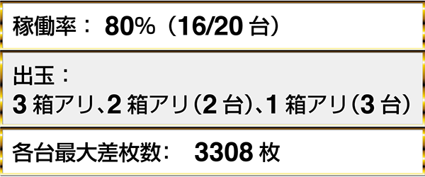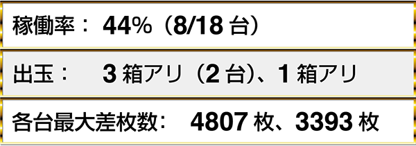『ミリオンゴッド-神々の凱旋-』や『沖ドキ!』に最大差枚数3000枚overを確認している。