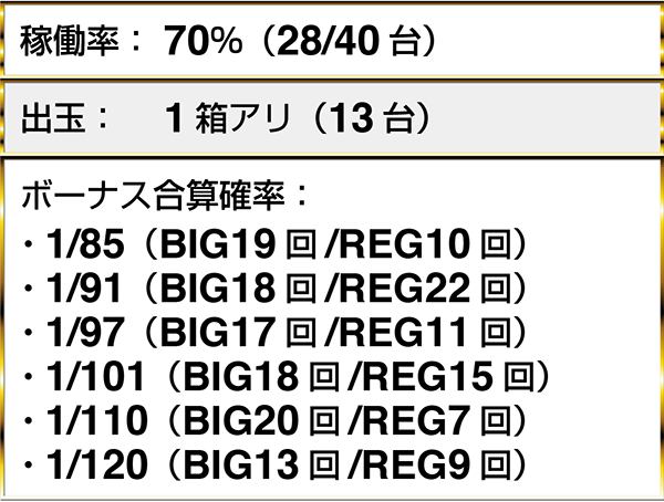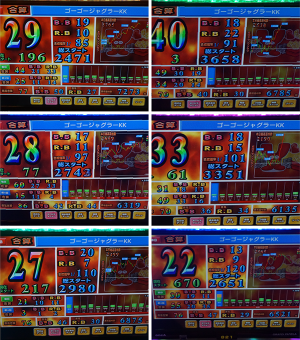 『ゴーゴージャグラー』をみると、6台以上がボーナス合算確率1/130以上であった。